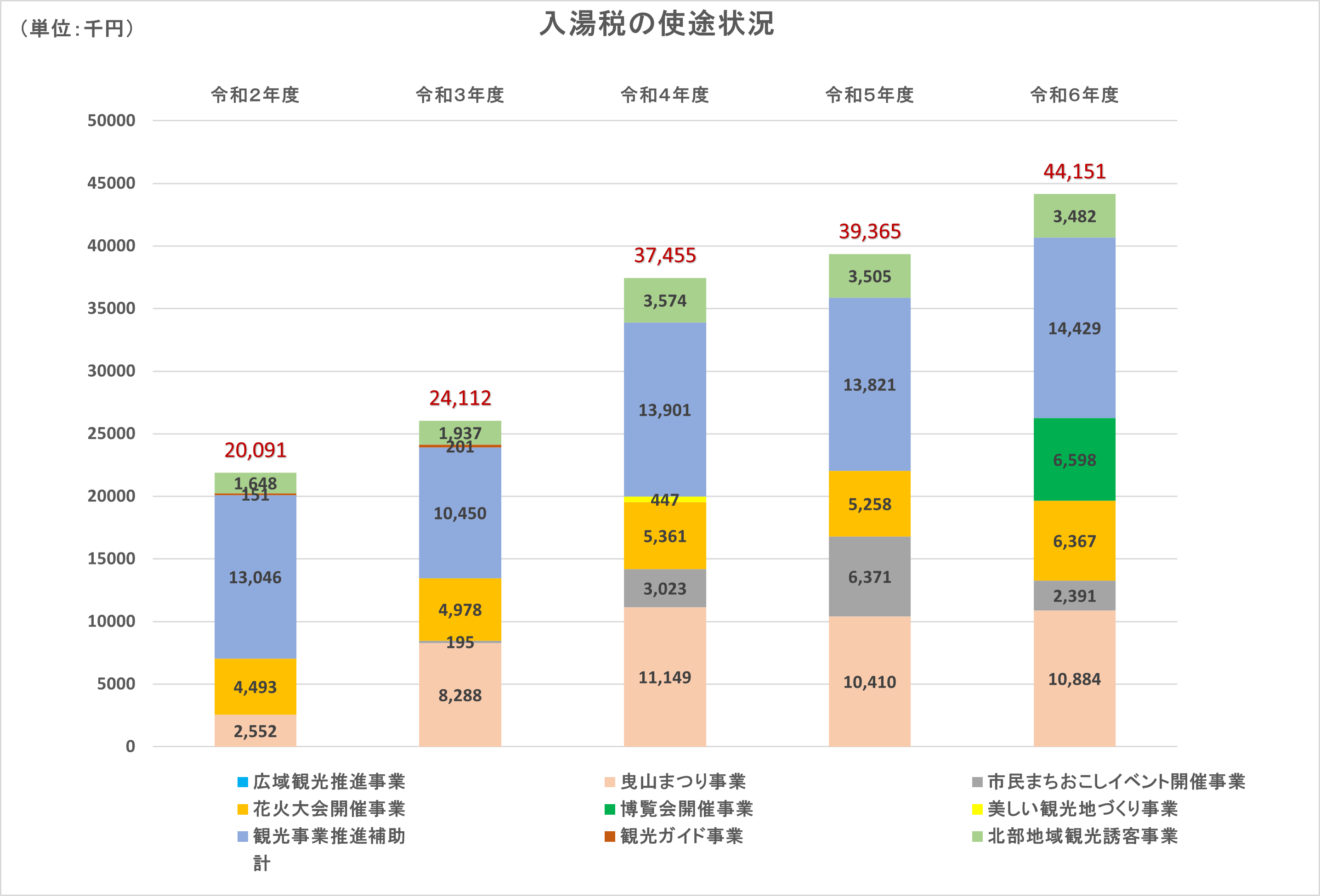 令和6年度は、376,896人の方から44,151千円の入湯税を納めていただきました。