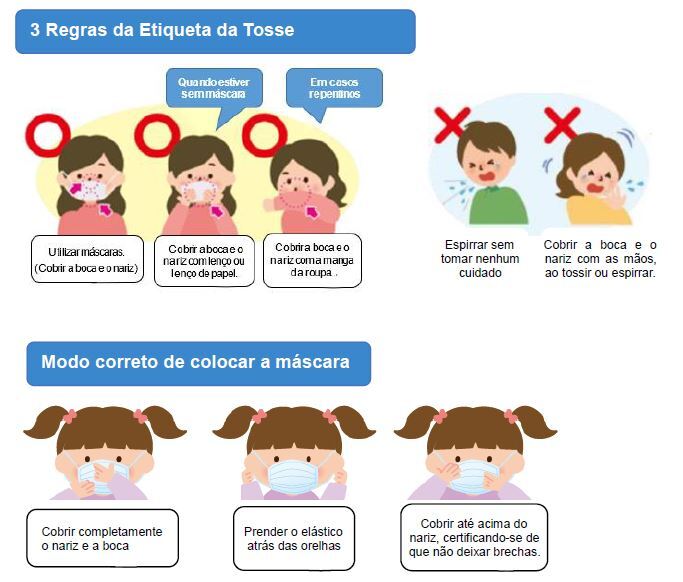 As medidas básicas para a prevenção de disseminação de doenças contagiosas, inclusive Covid-19, é [lavar as mãos] e a [etiqueta da tosse, que inclui o uso de máscara].
