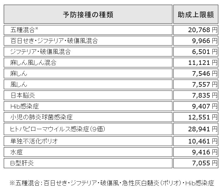 助成金の額は、表に定める金額を上限とし、申請者が当該対象予防接種の費用として医療機関に支払った金額とします。