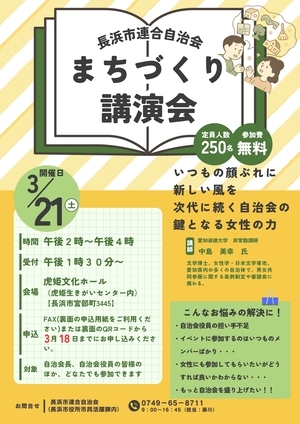 役員の担い手不足、高齢化等により、どの自治会でも抱えている悩みを解決すべく、長浜市連合自治会で『まちづくり講演会』を開催します。