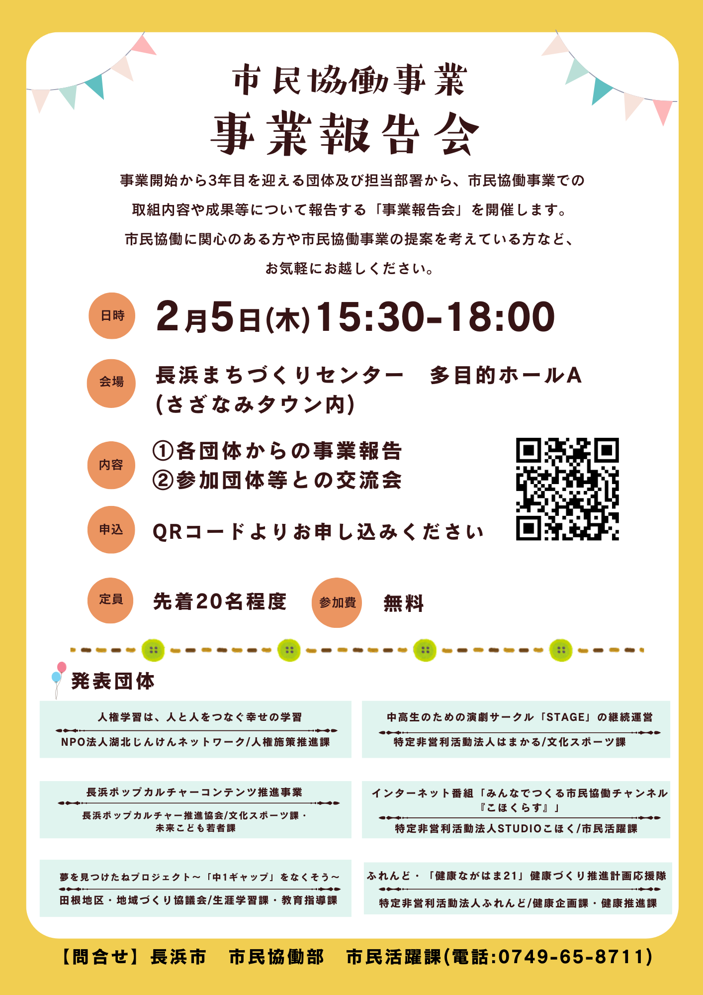 長浜市では、市民と行政が連携・協力して実施する市民協働事業を次のとおり募集しています。詳細な内容は募集要項をご確認ください。