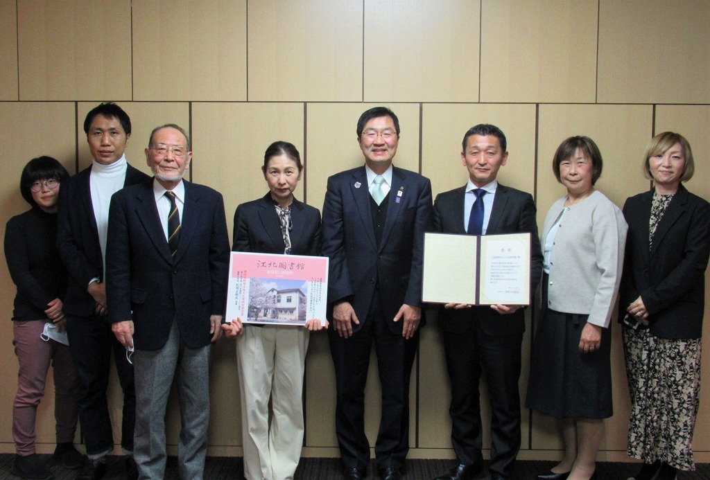 野間出版文化賞を受賞された江北図書館の皆さんが、表敬訪問にお越しいただきました。