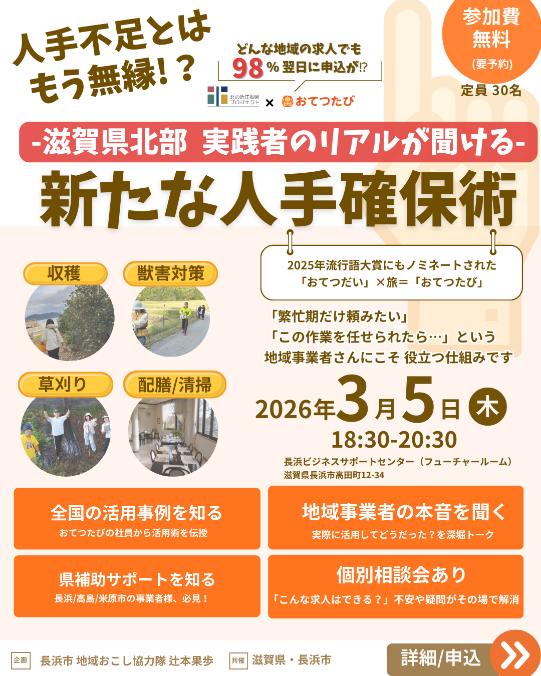 【辻本隊員】3月5日(木曜日)『人手不足とはもう無縁!?新たな人手確保術』滋賀県と長浜市に共催をいただき、イベントを開催します。(2月4日報告)