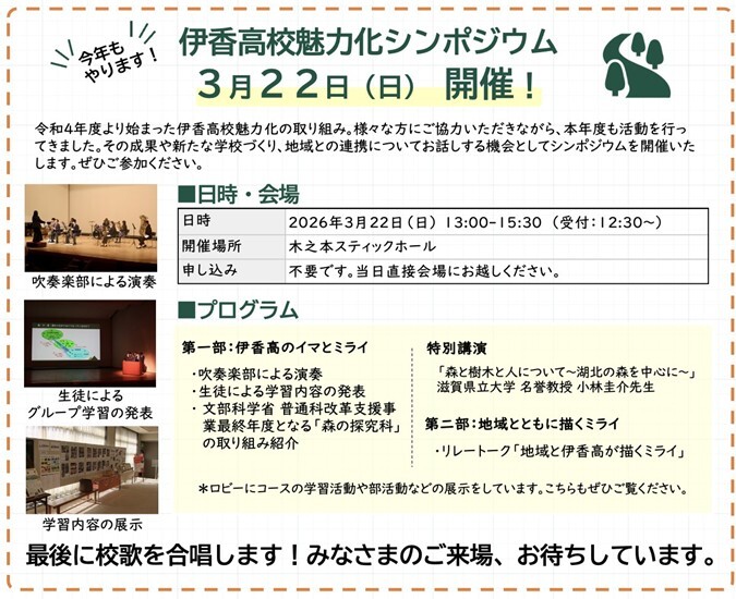 令和8年3月22日(日曜日)午後1時から、木之本スティックホールにて『伊香高校魅力化シンポジウム』を開催します。令和4年度から始まった伊香高校魅力化の取り組み。皆様にご協力いただきながら、本年度も活動を行ってきました。その成果や新たな学校づくり、地域との連携についてお話しする機会としてシンポジウムを開催いたします。