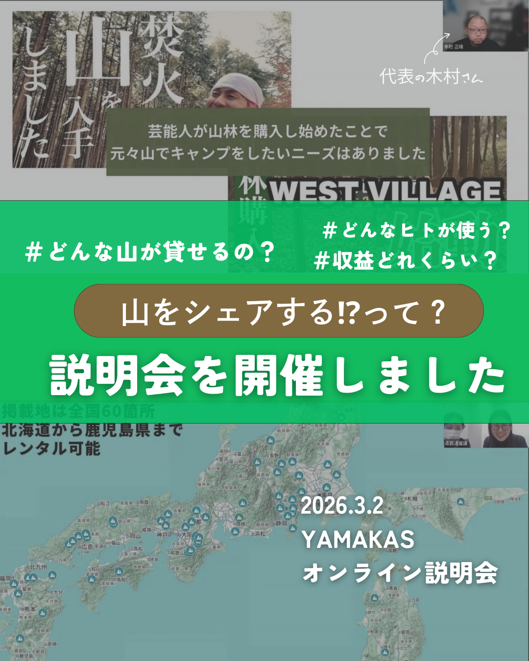 先日、山林のレンタルシェアサービス・YAMAKASを運営する、メディコム株式会社代表の木村さまをゲストにお招きし、
