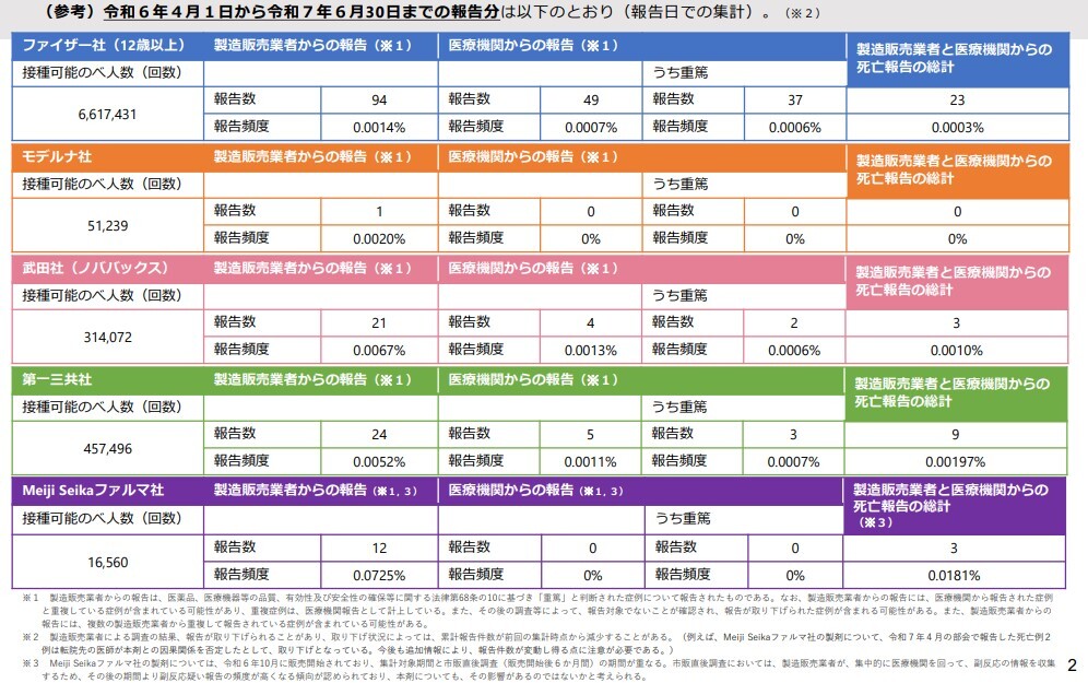 下集計表は令和6年4月1日から令和7年6月30日までに副反応疑いとして国に報告された件を集計したものです。