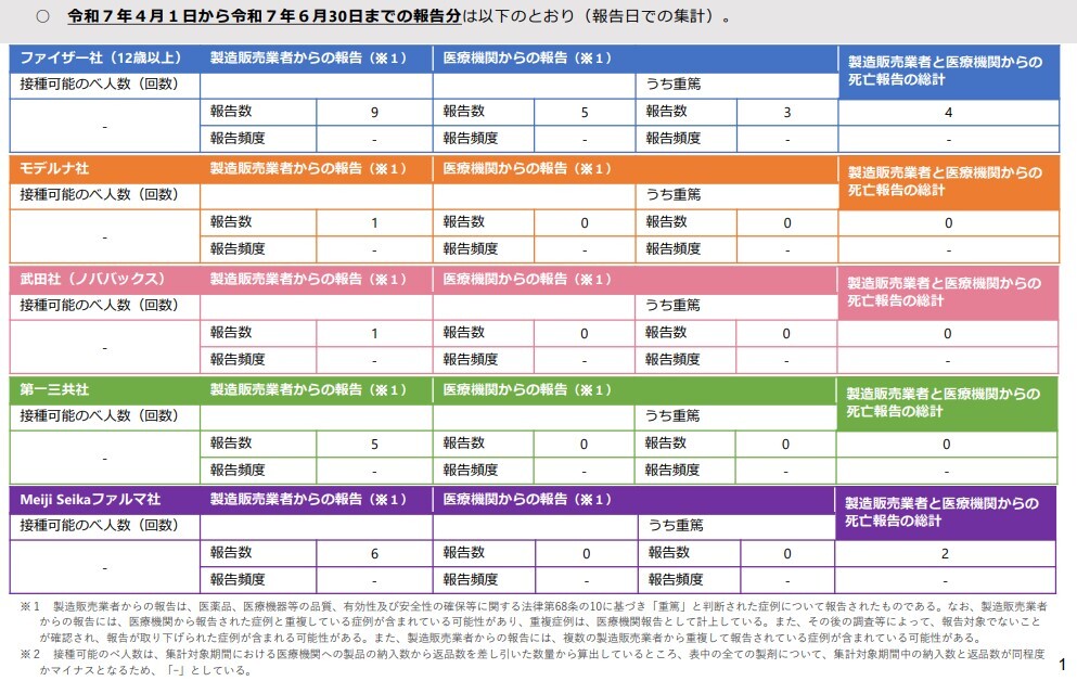下集計表は令和7年4月1日から令和7年6月30日までに副反応疑いとして国に報告された件を集計したものです。
