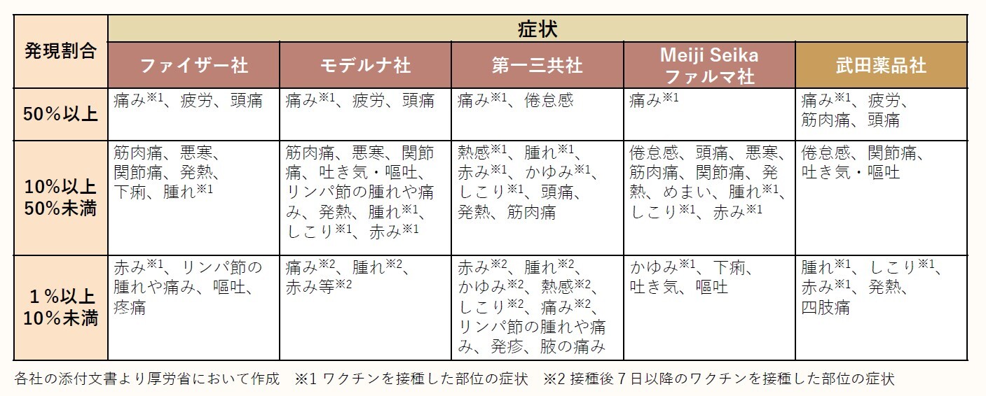 各社のワクチンについては、以下のような副反応がみられることがあります。また、頻度は不明ですが、重大な副反応としてmRNAワクチンについては、ショック、アナフィラキシー、心筋炎、心膜炎、組換えタンパクワクチンについては、ショック、アナフィラキシーが見られることがあります。