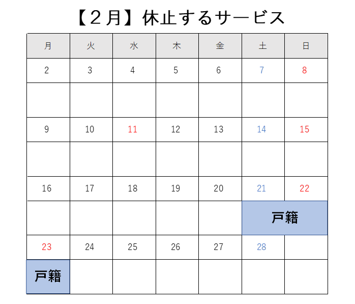 ※「戸籍」と記載の日は、戸籍証明書、戸籍の附票謄本及び戸籍の利用登録申請のサービスを休止します。