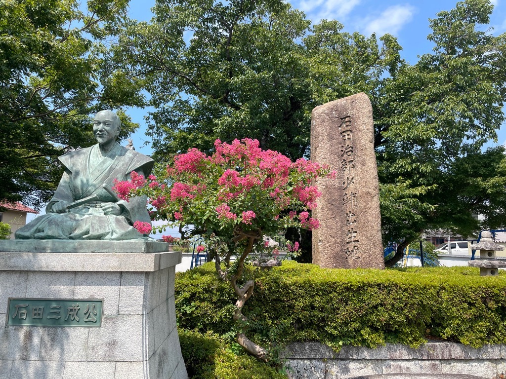1.石田会館(石田三成出生の地)→2.小西行長の街灯→3.石田治部少輔三成屋敷跡→4.石田三成産湯井戸→5.石川貞清の街灯→6.島津義弘の街灯→7.真田昌幸の街灯→8.石田三成公供養塔