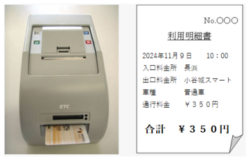 (各施設に設置されている下記発行プリンターにて、入口料金所または出口料金所の表示が「小谷城スマート」と表示されている利用明細書を印刷)