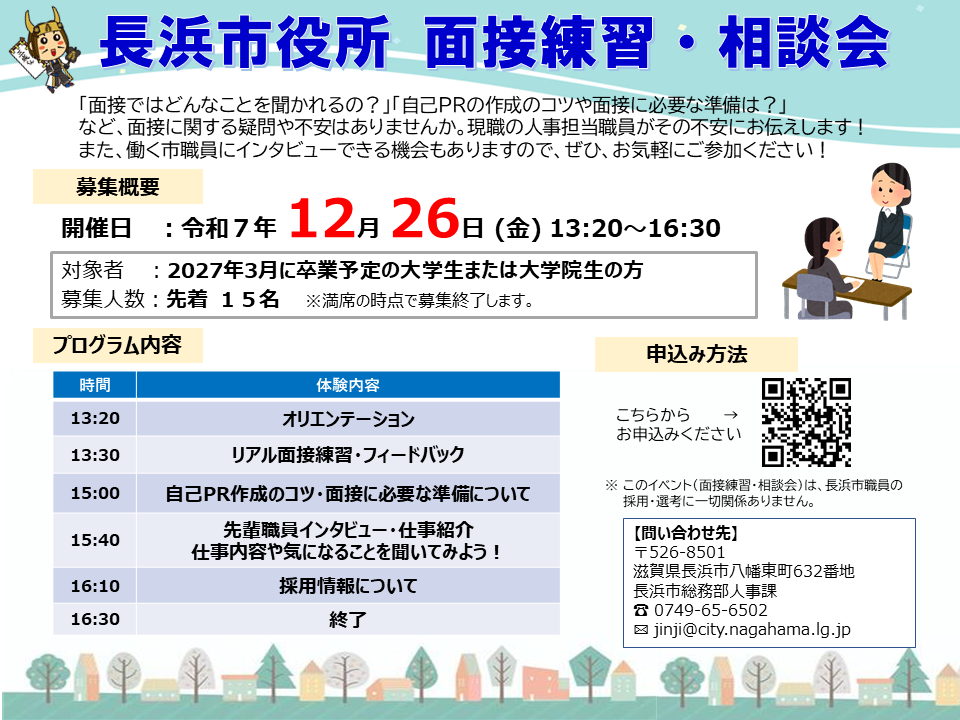 長浜市役所では、令和7年12月26日に「面接練習・相談会」を開催しますので、ぜひご参加いただき、面接試験に対する不安を解消しませんか。