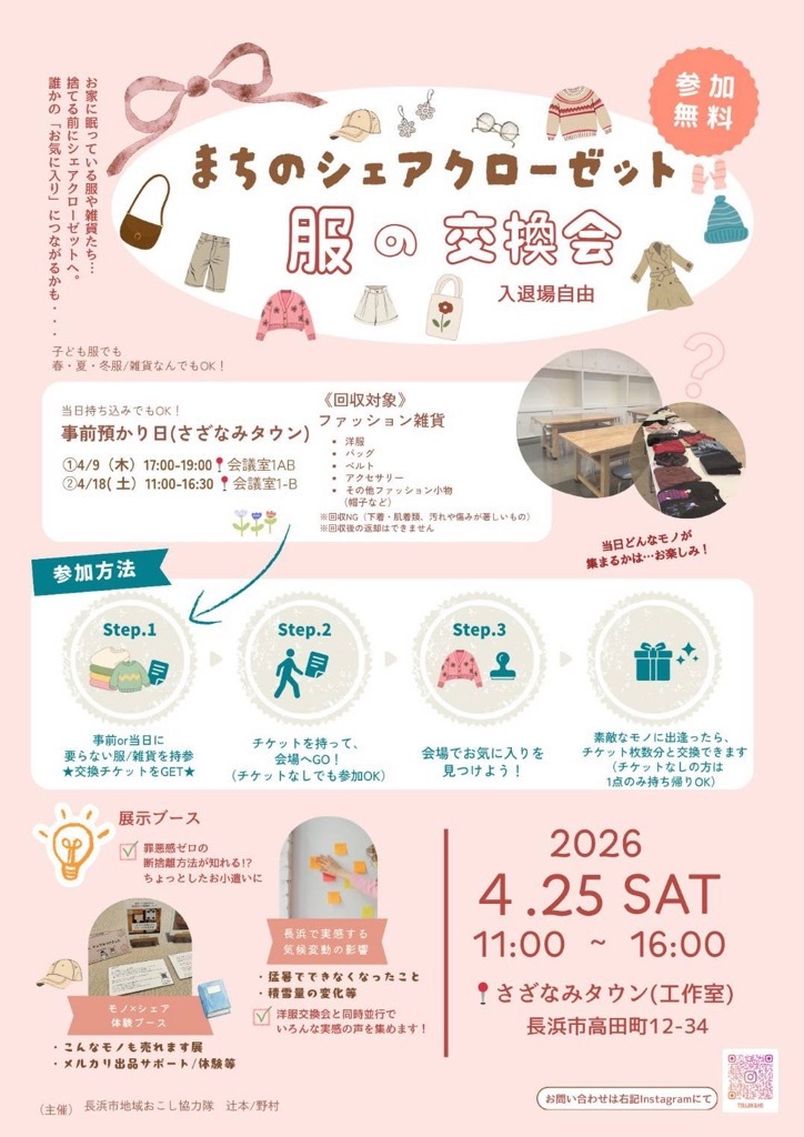 4月25日(土曜日)、さざなみタウンにて「まちのシェアクローゼット~服の交換会~」が行われます。