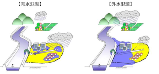 - 内水氾濫:下水道の排水が追いつかなくなり、河川の水位上昇により街中の水が排水できなくなり溢れる現象
