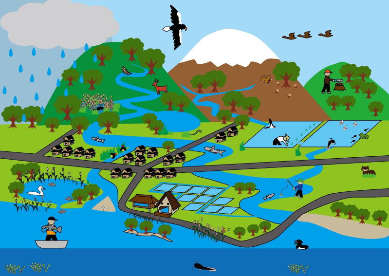 | B生計 水や生きものの恵みは、私たちの生計を支えてくれています。(例:水産業、狩猟、農業、林業など) |