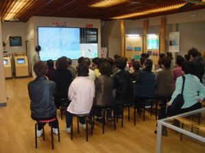 ライブカメラでセンター前の様子を映しながら職員が説明します。 剥製や水鳥の声などの資料展示もたくさんあります。 一周すると琵琶湖の生き物のことが分かるようになっています。 |